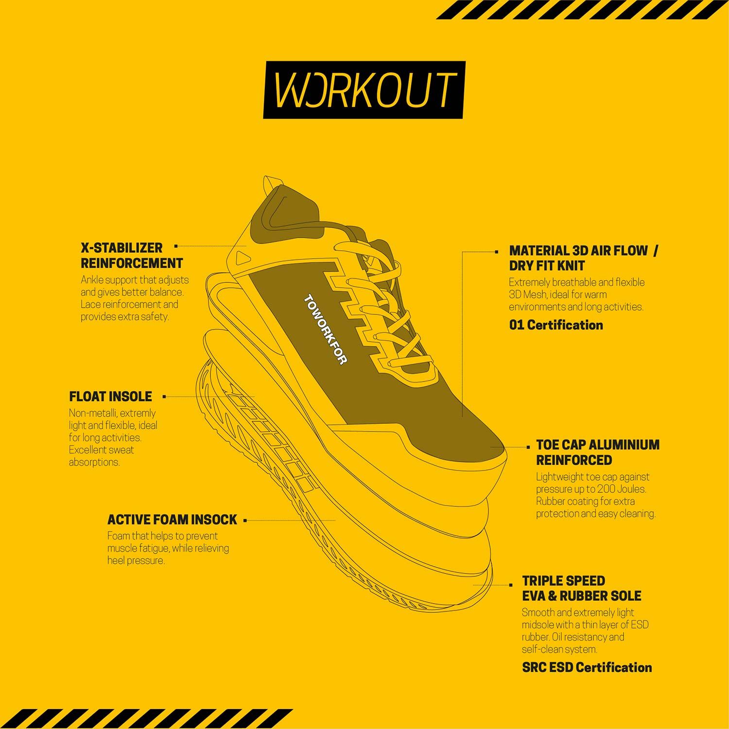 Inspired by the look and performance of the best sports shoes, the new WORKOUT COLLECTION provides the protection, comfort, and performance that every worker needs, every day. Don't let the WORKOUT sporty look and lightweight fool you, these are real tough safety work shoes!